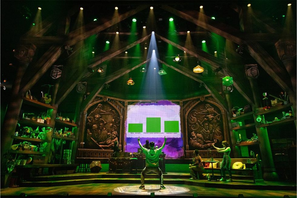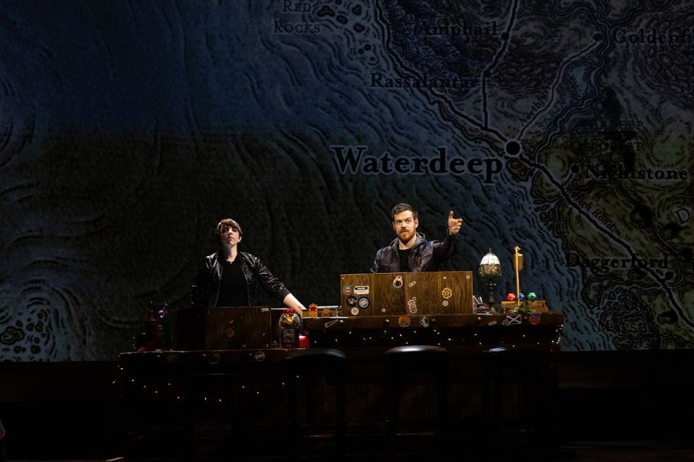 And if the notion of making up a show based on audience shout-outs and dice rolls seems tough, imagine doing it all while directing, too. The game’s scenarios are depicted on a massive LED wall at the rear of the stage, changing dynamically with hit point meters and visualizations of the combat effects onscreen, all manually controlled in real-time by the Dungeon Master and Tavern Keeper. Working in tandem to keep both the gameplay and the technical aspects of the show on the rails, the frenzy of their overlapping roles adds a precariousness to the house of cards vibe of the show. Yet they remain undeterred.