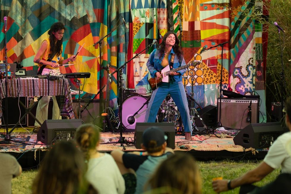 Later came a set by Reyna Tropical, a duo fronted by Fabi Reyna, known in a past life as the founder of the great 2010s rock magazine She Shreds. Now she’s making awesomely cosmic electro-cumbia grooves, steeped in physical sensation and awareness of the earth. Reyna played long, lyrical guitar solos over her bandmate’s pulsing beats and exhorted her audience to remember the indigenous ancestors who tended the land first. “When you step on that concrete floor, when you step into the darkness of a venue, that’s still land,” she reminded us. As the sun began to set and the wind swept in, Reyna Tropical’s music felt transcendent. “We get to see the intersection of night and day,” she marveled. “Can you believe that we get to witness that together?”