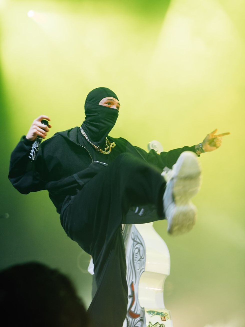 The crowd at the Moody Theater roared when Peso Pluma appeared onstage wearing a black ski mask. This is the power of la Doble P: Even masked, he has the power to suck all of the oxygen out of the room, with every single person waiting to hear his signature raspy voice. At full tilt, he ran around the stage, feeding off of the energy in the crowd as he danced, making the comparisons from his manager that he’s “the Mexican Mick Jagger” come into focus. With his band behind him, it felt cinematic, like Peso was the main character in an action film with a live orchestra behind him. “The Doble P is back, motherfuckers!” he told the crowd. Ripping off his mask, he promised the crowd one of the most memorable nights of their lives, and he delivered, tearing through hit after hit. Throughout the high-octane set, he rarely stood still, constantly bouncing across the stage, headbanging, and even getting into the pit and moving through the crowd as they went wild trying to get close to him. —C.C.