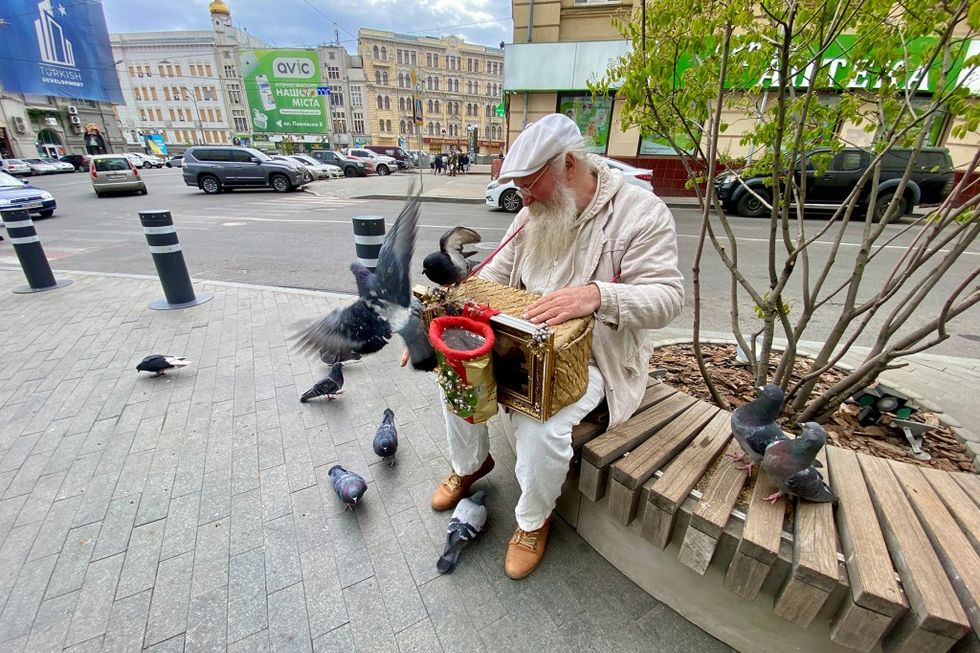 Back in Kharkiv, Viktor Viktorivich, who is probably in his 80s but says he is “always 16,” sits in a public square in front of a new shopping mall. With a long flowing white beard, clad in white clothes and a flat cap, he is surrounded by pigeons as he plays a music box. He spent his life in the Soviet Army as a medic; many of his friends died in Afghanistan. He has relatives in Moscow. He hasn’t spoken to them since the war started.