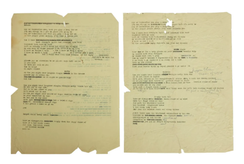 Comme l’a rapporté Rolling Stone, Bob Dylan a dactylographié les premières paroles de Mr. Tambourine Man en 1964 alors qu’il séjournait chez Al Aronowitz, dans le New Jersey. Après le départ de Dylan, Aronowitz a trouvé les brouillons froissés, accompagnés de notes manuscrites de l’artiste, dans une poubelle. Cependant, après la mort d’Aronowitz en 2005, sa famille n’a pas immédiatement retrouvé les paroles.