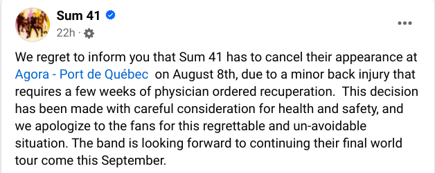 «Nous regrettons de nous informer que Sum 41 doit annuler (ses performances), dû à une blessure minure au dos qui demande plusieurs semaines de convalescence ordonnée par le médecin. Cette décision a été prise dans un souci de santé et de sécurité. Nous nous excusons auprès des fans pour cette situation malheureuse et inévitable», peut-on lire sur la page Facebook du groupe.